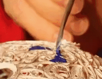 燒藍 是將整個胎體填滿色釉后,再拿到爐溫大約800℃的高爐中烘燒,色釉由砂粒狀固體熔化為液體,待冷卻后成為固著在胎體上的絢麗的色釉,此時色釉低于銅絲高度,所以得再填一次色釉,再經(jīng)燒結,一般要連續(xù)四五次,直至將紋樣內填到與掐絲紋相平。